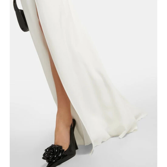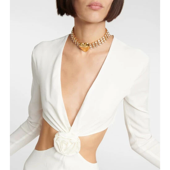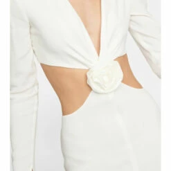 Equal parts romantic and daring, this long-sleeved gown from Blumarine features a wide cutout at the waist, accented with a three-dimensional rose embellishment. A deep V-neck and a bold front slit complete the fluid design.