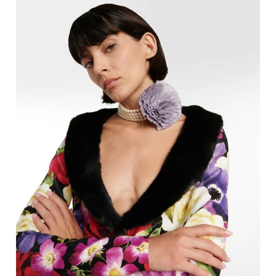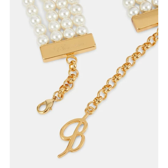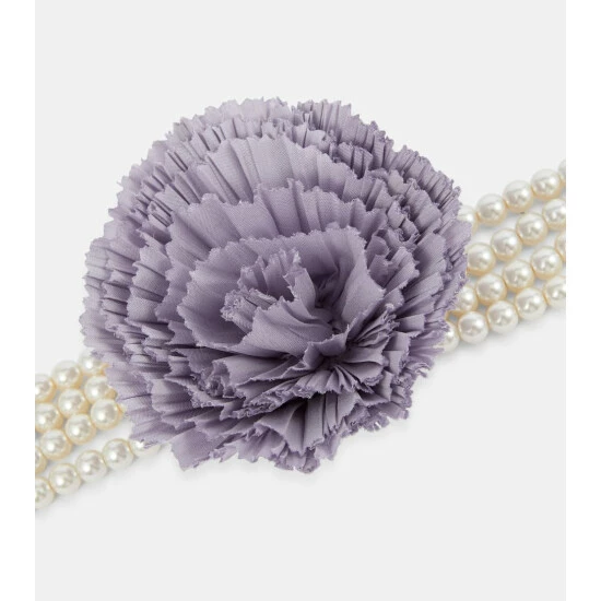 Let your neck be the focus of your look, with this four-row pearl choker from Blumarine. It features the brand’s signature rose trim, made from purple taffeta, placed asymmetrically.