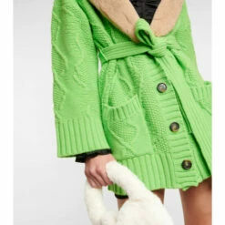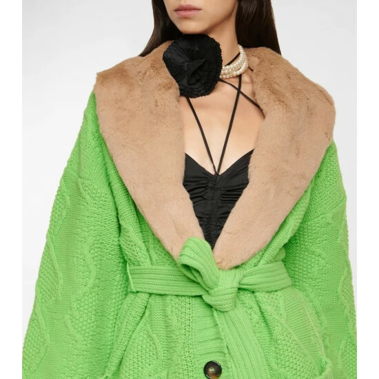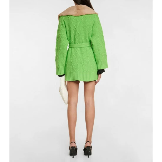 This wool cardigan from Blumarine has a cableknit-finish, and is presented in neon green with a faux shearling collar.