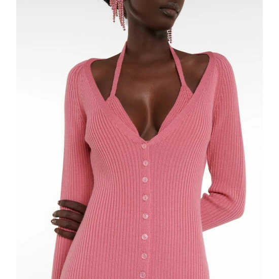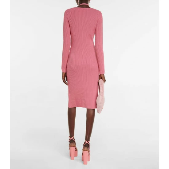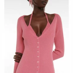Embrace Y2K’s glamour with Blumarine’s feminine designs. Made from virgin wool yarns in pink, this ribbed dress features a curve-hugging fit, a buttoned front, and a very low neckline that showcases the matching knitted bra.