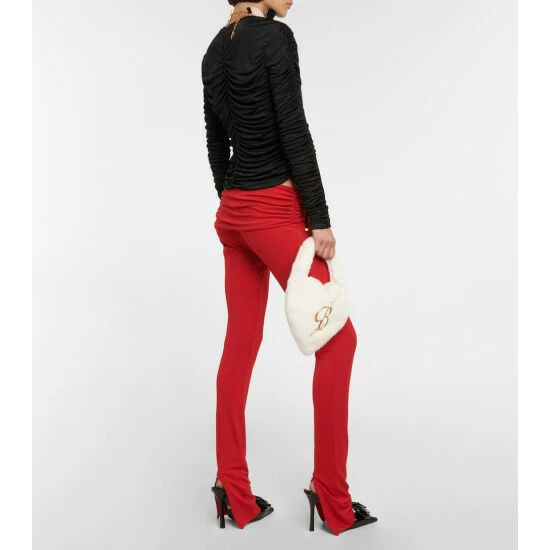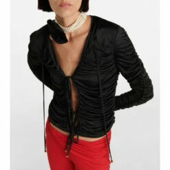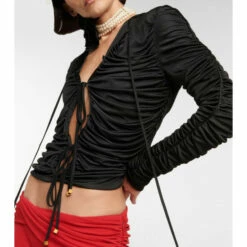 Blumarine goes for volume with this black top, featuring ruching on the body and sleeves. The design has a fitted silhouette and is closed with ties at the center that give a delicate touch.