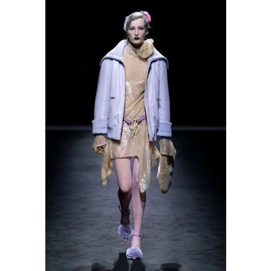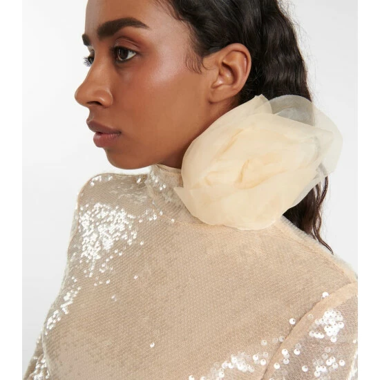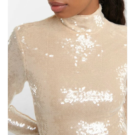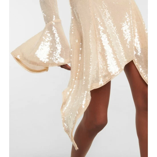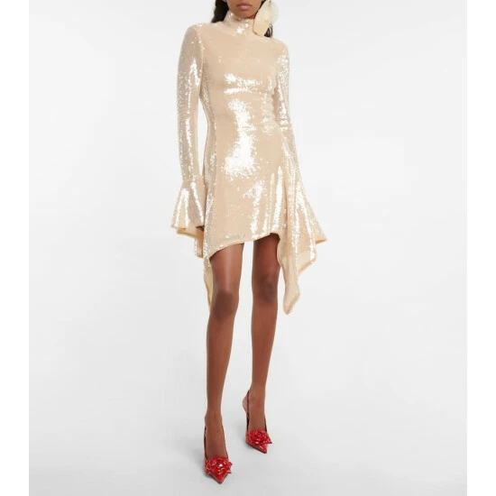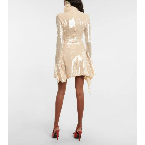 Make a Y2K statement this party season with this golden Blumarine dress. Doused in sequins, this design has a floral-embellished high neckline, fluted sleeves and an asymmetrical hemline.