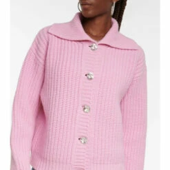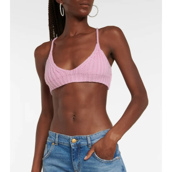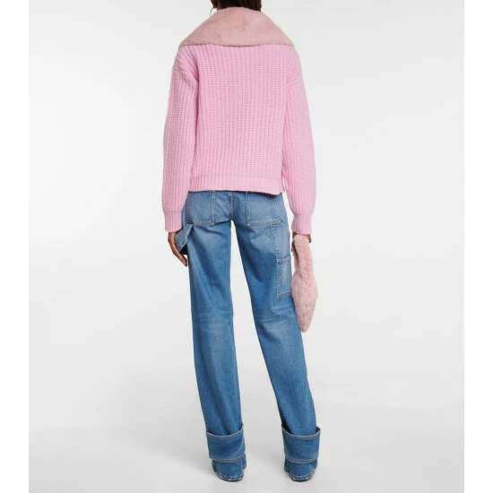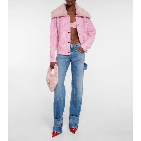 Romantic and daring at once, this set perfectly captures Blumarine’s essence. Revisiting an iconic style, the cardigan is knitted from virgin wool with a detachable faux fur collar and shimmering crystal buttons on the front. It comes with a matching bralette.