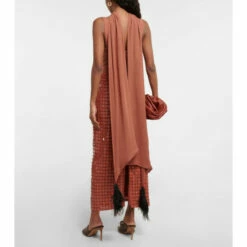 This maxi dress from Johanna Ortiz is made from crêpe that’s detailed with tonal stitching and embellished with square-shaped discs. It has a bustier bodice comes with removable straps and a matching feather-trimmed scarf.
