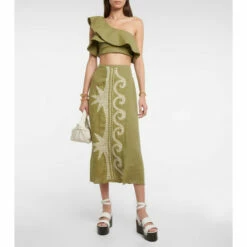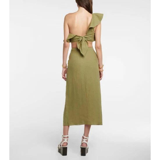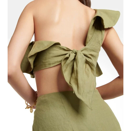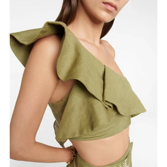 A one-shoulder design, Johanna Ortiz’ De Mar a Mar crop top is made from pure linen and features a generous ruffle trim.