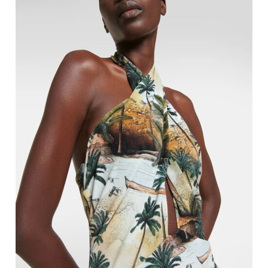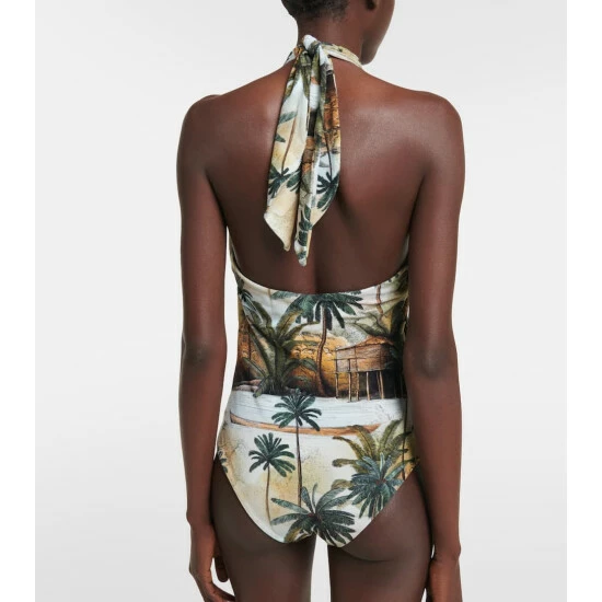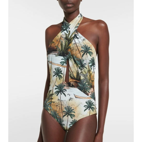 Make a splash in Johanna Ortiz’s characterful Hidden Paradise swimsuit. This halterneck style has a tropical print and a dramatic plunge profile with a high-rise base.