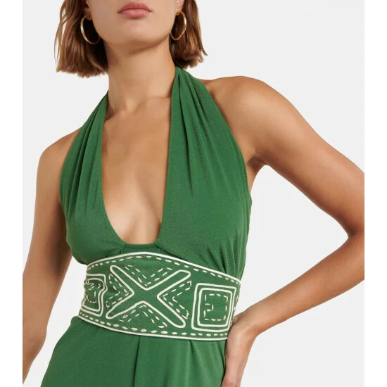 The Lagoon Affair midi dress from Johanna Ortiz features a halter straps that can be styled two ways, including crossed over the front. It’s handmade in Colombia with embroidery at the waist.