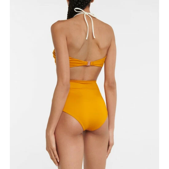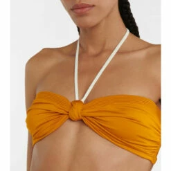 The Moonrise At Sea bikini top from Johanna Ortiz has a ruched bandeau design that’s topstitched along the upper. It hangs from a contrast-colored halterneck that’s attached to the piece via a knot.