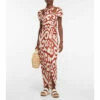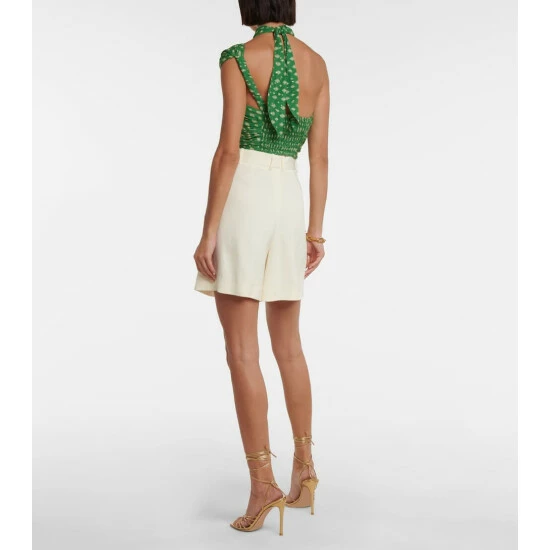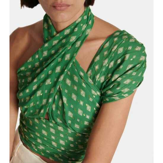 Featuring an asymmetric design with one puffed shoulder, the Okeanos top from Johanna Ortiz gives a contemporary summer look. It has a wrap halterneck, a ruched body, and is made from green silk with fil coupé details.