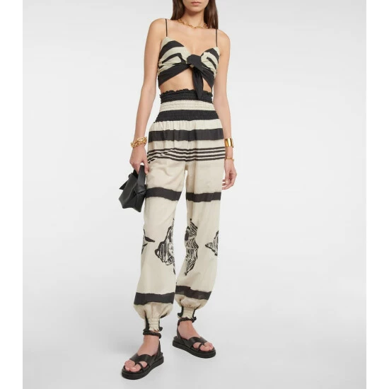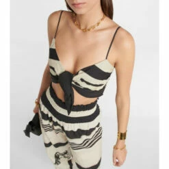 This crop top from Johanna Ortiz is an ideal summer vacation piece for dressing up or down. The elegant style features a bold geometric pattern and a self-tie at the front.