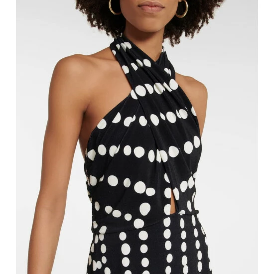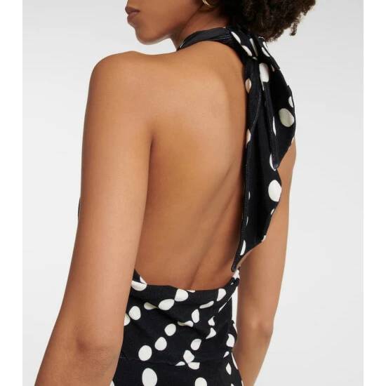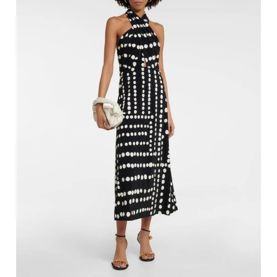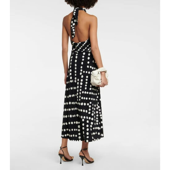 This midi dress from Johanna Ortiz has a halter neckline with a self-tie back and a front cut-out detail. It falls to a midi-length silhouette and features a dotted print.