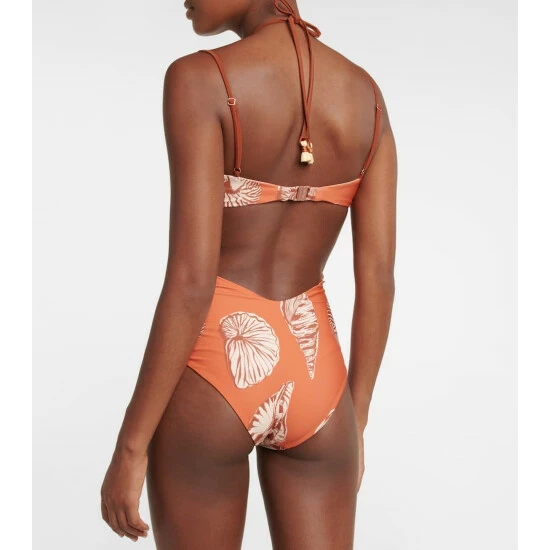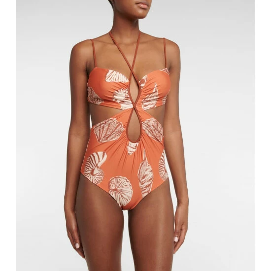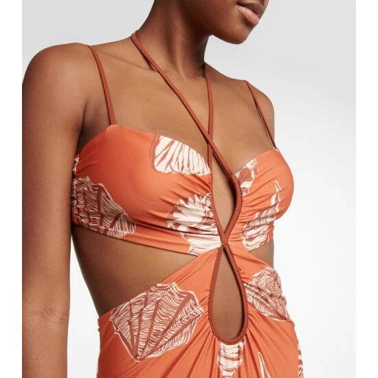This swimsuit from Johanna Ortiz features a halterneck that creates a deep plunge at the front and ends with a drop-shaped cutout. It’s made from swim fabric.