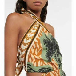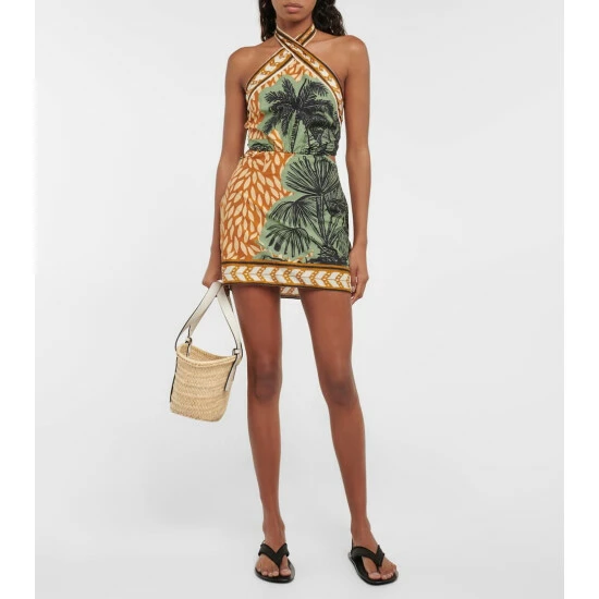 The Reminders Of Paradise minidress from Johanna Ortiz is aptly named, embodying quintessential vacationwear with its palm trees print and breezy cotton fabric. This piece is designed with a halterneck and open back with a self-tie fastening.