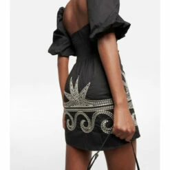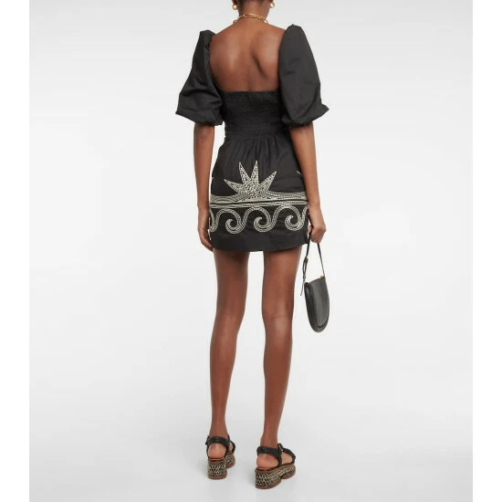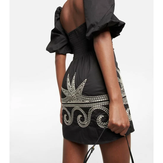 Johanna Ortiz’s Simple Pleasures minidress is made from a cotton blend with decorative stitching in the form of waves and palms. It has puff sleeves and a gathered bodice with a front cutout.