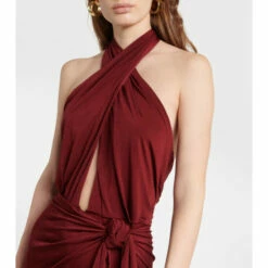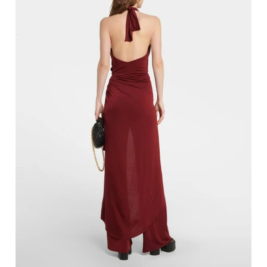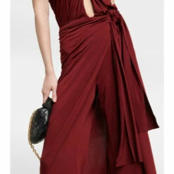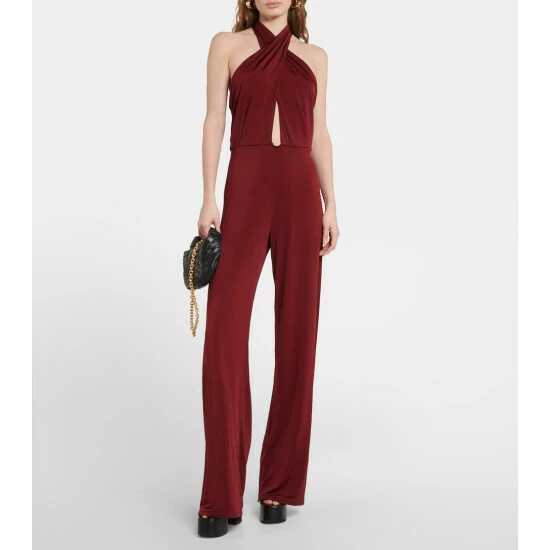 The Submerged jumpsuit from Johanna Ortiz is an effortlessly elegant style. Cut from jersey with a draped effect and wrap over skirt, it has a halterneck top, keyhole cutout, and wide legs.