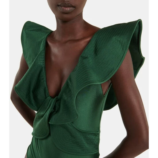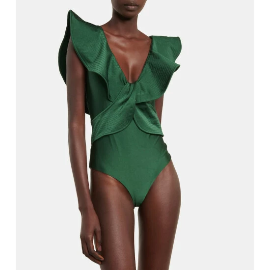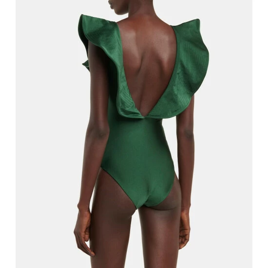 The Ocean Song swimsuit from Johanna Ortiz is framed with a voluminous flounce that traces the shoulders and crosses over at the waist. It’s made from lustrous swim jersey with intricate topstitching and high-cut legs.